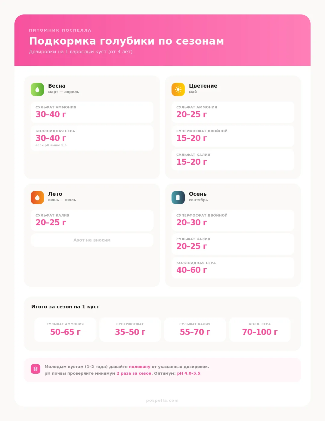Коллоидная сера: 40-60 г на куст, если pH поднялся за сезон. Осень — лучшее время для серы, она успеет сработать к весне.
